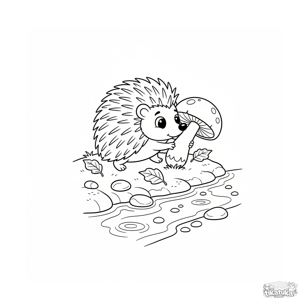 Ausmalbild für Kinder 4-6: Ein neugieriger Igel sammelt Pilze am moosigen Ufer eines klaren Baches, mit Herbstblättern und Kieselsteinen ringsum.