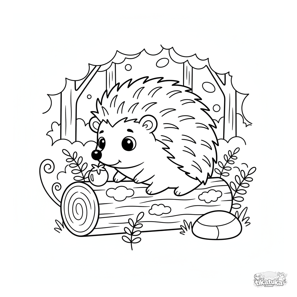 Ausmalbild eines süßen Igels auf einem moosigen Baumstamm. Für Kinder von 5-7 Jahren. Zeigt einen neugierigen Igel, der eine Beere untersucht.