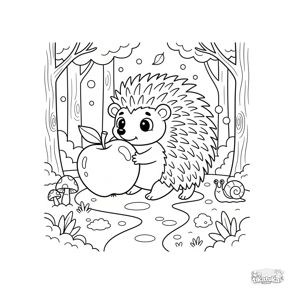 Ausmalbild für Kinder 4-6: ein neugieriger Igel schiebt einen Apfel einen moosigen Waldweg entlang. Einfache Formen und eine niedliche Szene.