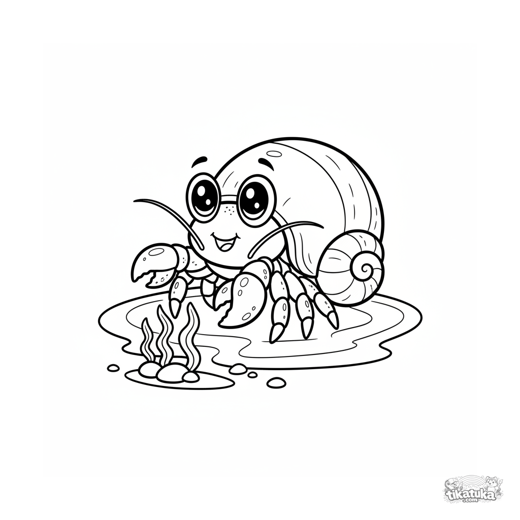 Ausmalbild eines süßen Einsiedlerkrebses, der aus seinem Haus in einem sonnigen Gezeitentümpel im Flachwasser lugt.