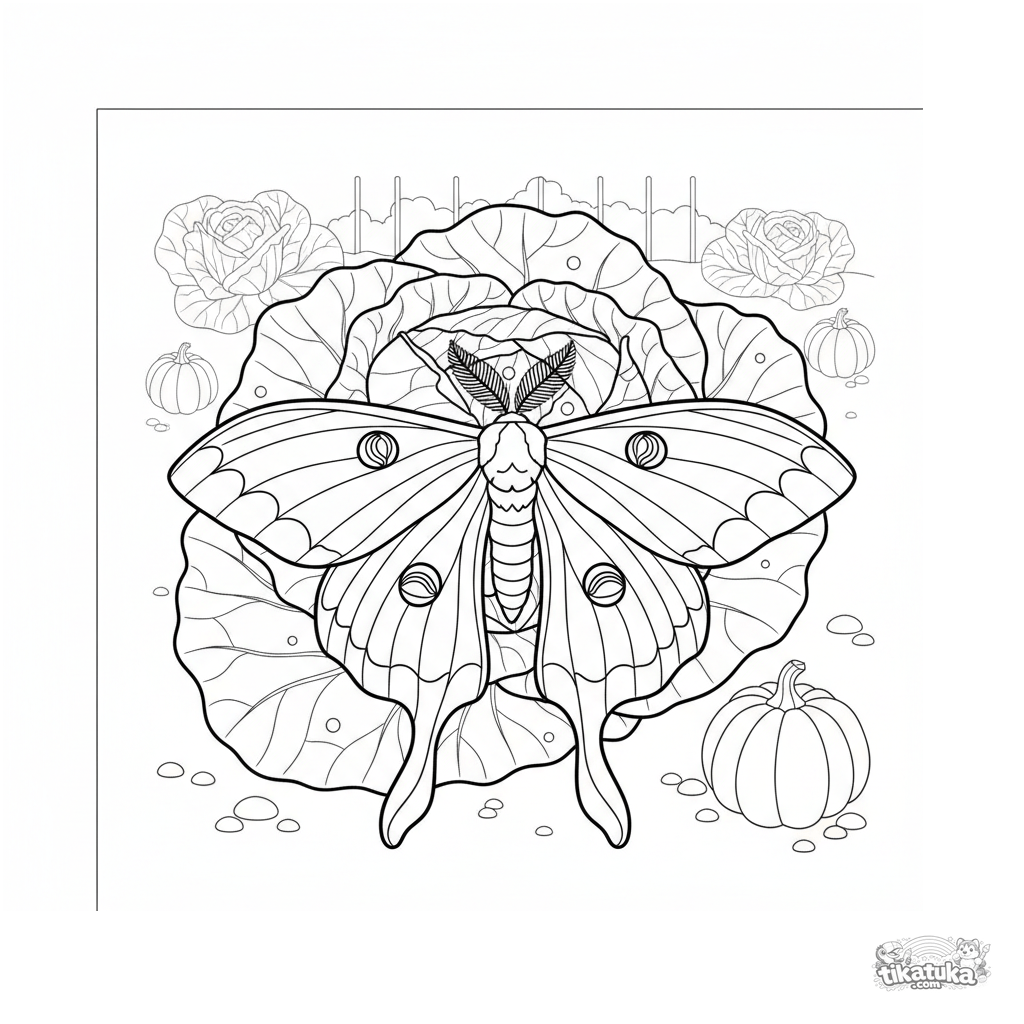 Ausmalbild für Kinder von 4-6: ein schönes Nachtpfauenauge ruht auf einem taubedeckten Kohlblatt. Mäßiges Detail, erkennbare Insekten- und Pflanzenformen.