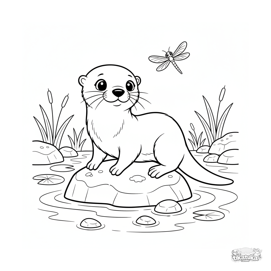 Ausmalbild für Kinder 4-6: Ein neugieriges Otterjunges balanciert auf einem Stein in einem klaren Bach und beobachtet eine Libelle.