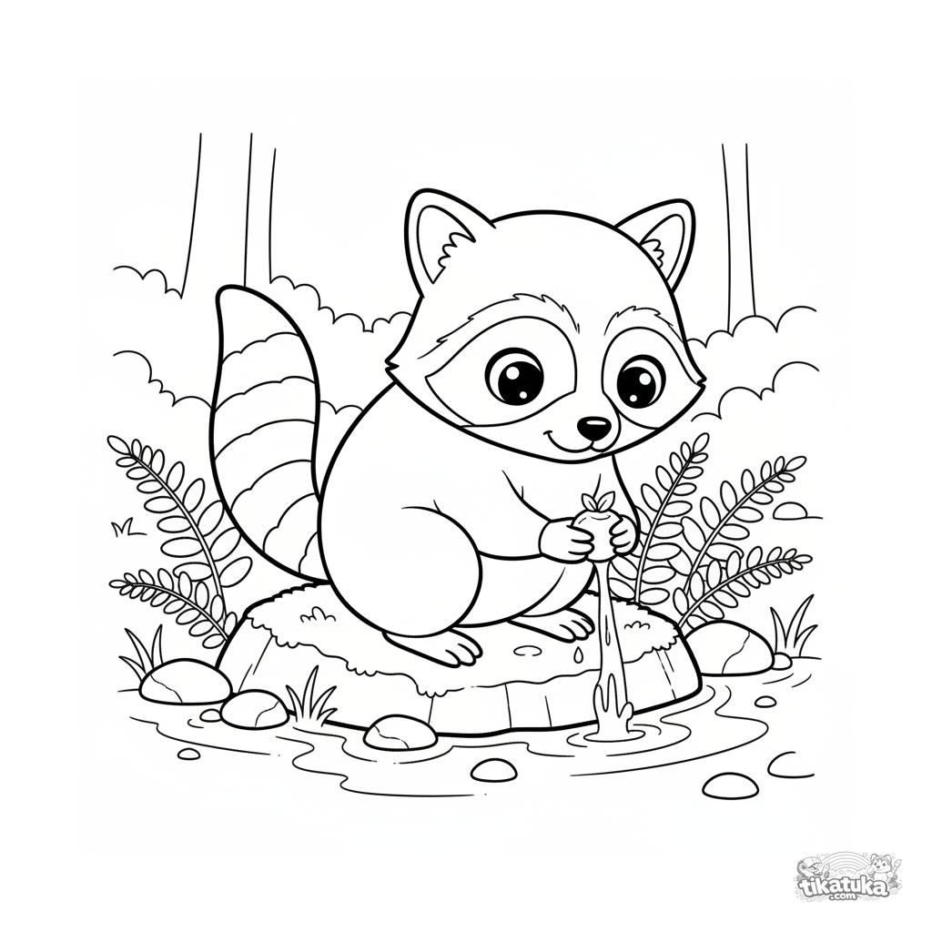 Ausmalbild für Kinder 4-6: Ein neugieriger Waschbär wäscht eine Beere am Ufer eines klaren Baches. Niedliche Szene mit Steinen und Farnen.