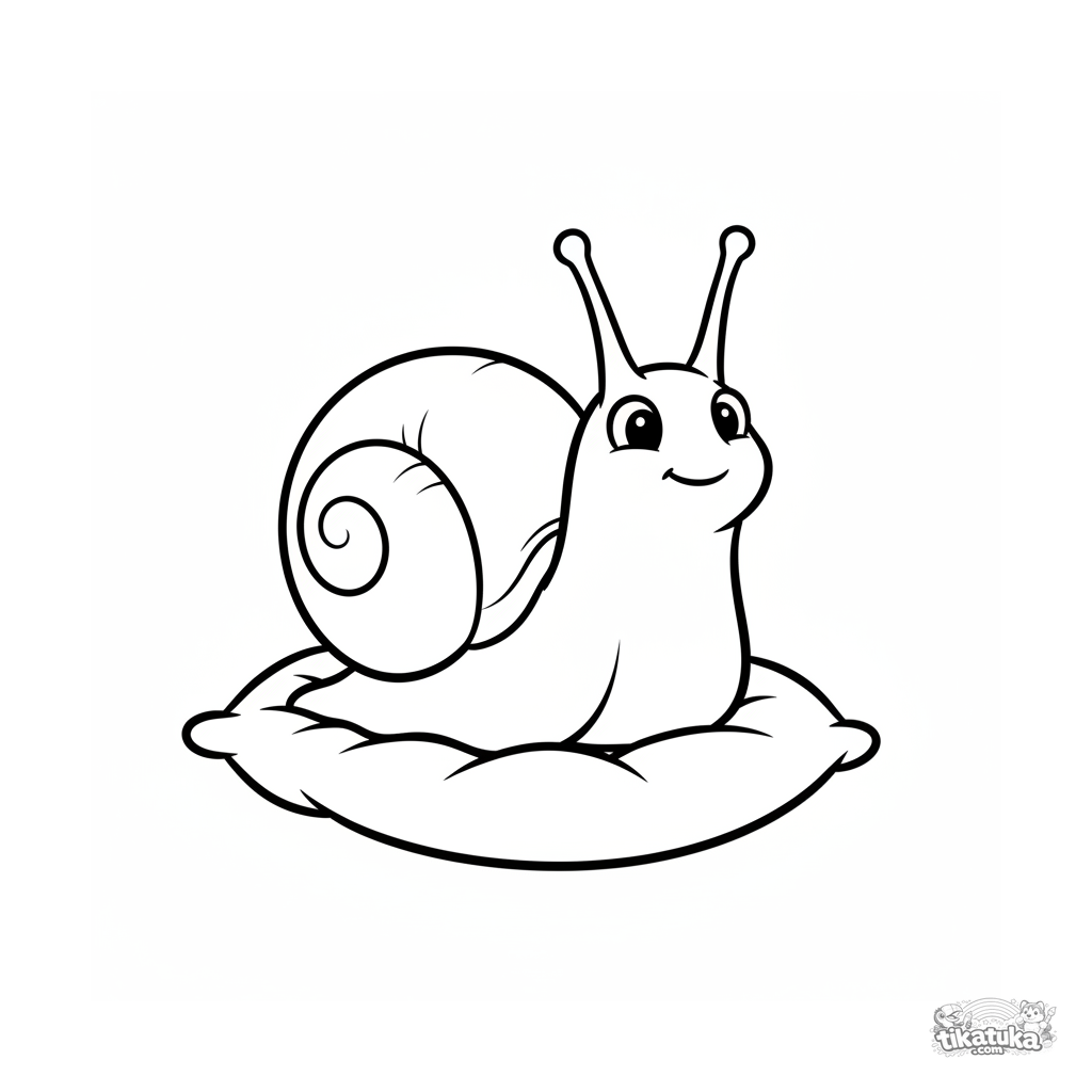 Ausmalbild für Kleinkinder 2-3 Jahre: eine neugierige Schnecke mit großen Augen ruht auf einem weichen Kissen. Einfache Umrisse.