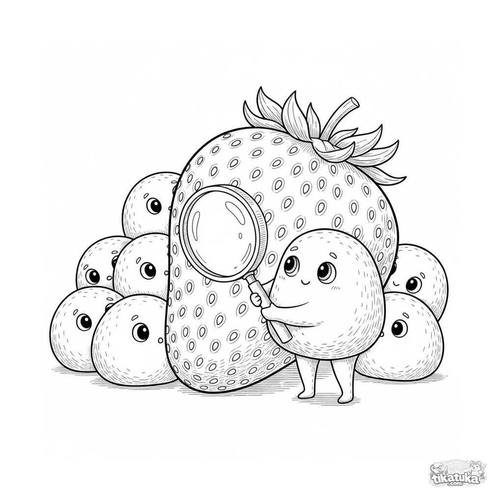 Detailliertes Ausmalbild im Stil eines alten Stichs: Ein Mochi mit Lupe untersucht eine Riesen-Erdbeere. Für 10-12 Jahre, wissenschaftlich interessiert.