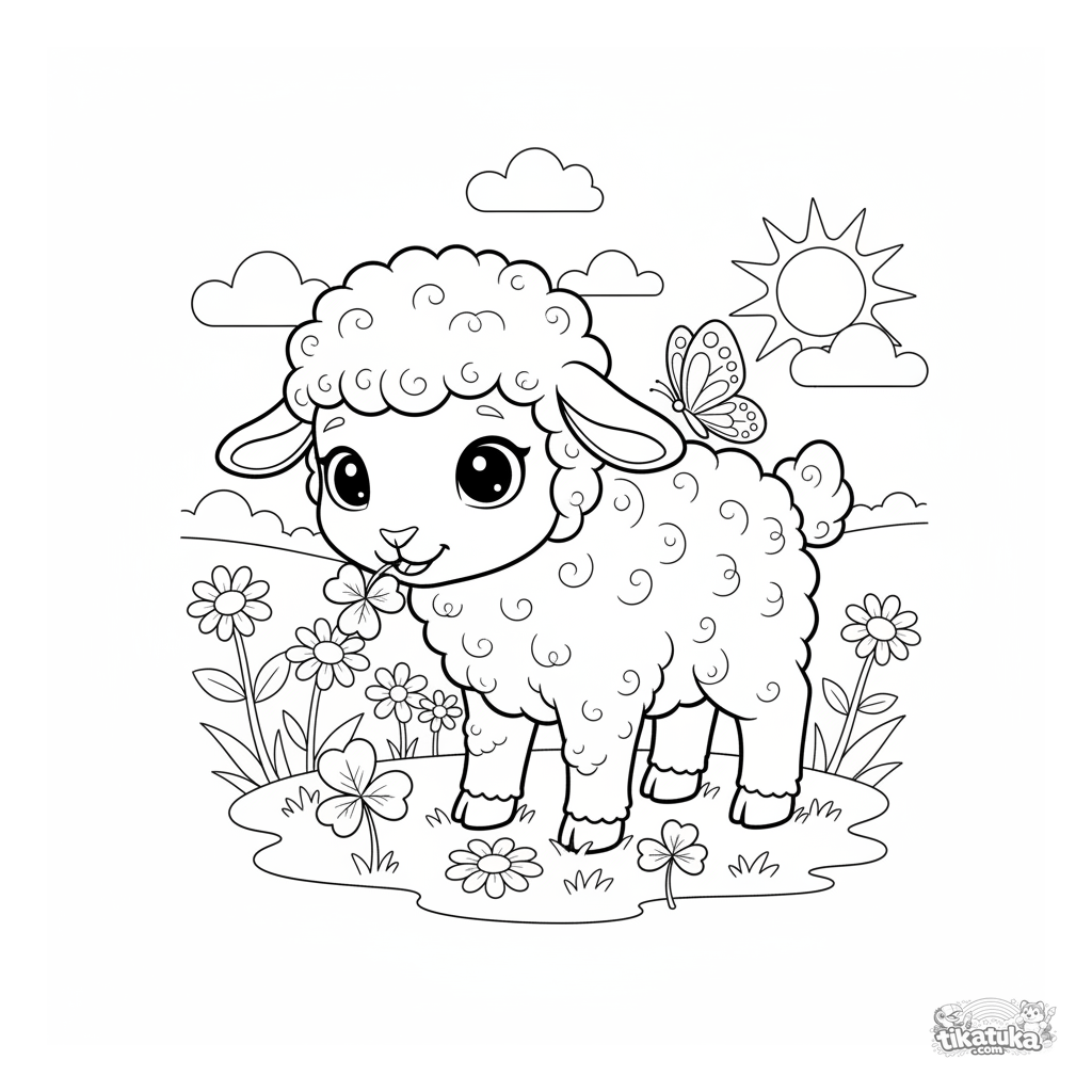 Ausmalbild eines lockigen Lamms auf einer Frühlingswiese. Für Kinder von 4-6 Jahren. Das Lamm knabbert an Klee, ein Schmetterling sitzt auf seinem Rücken.