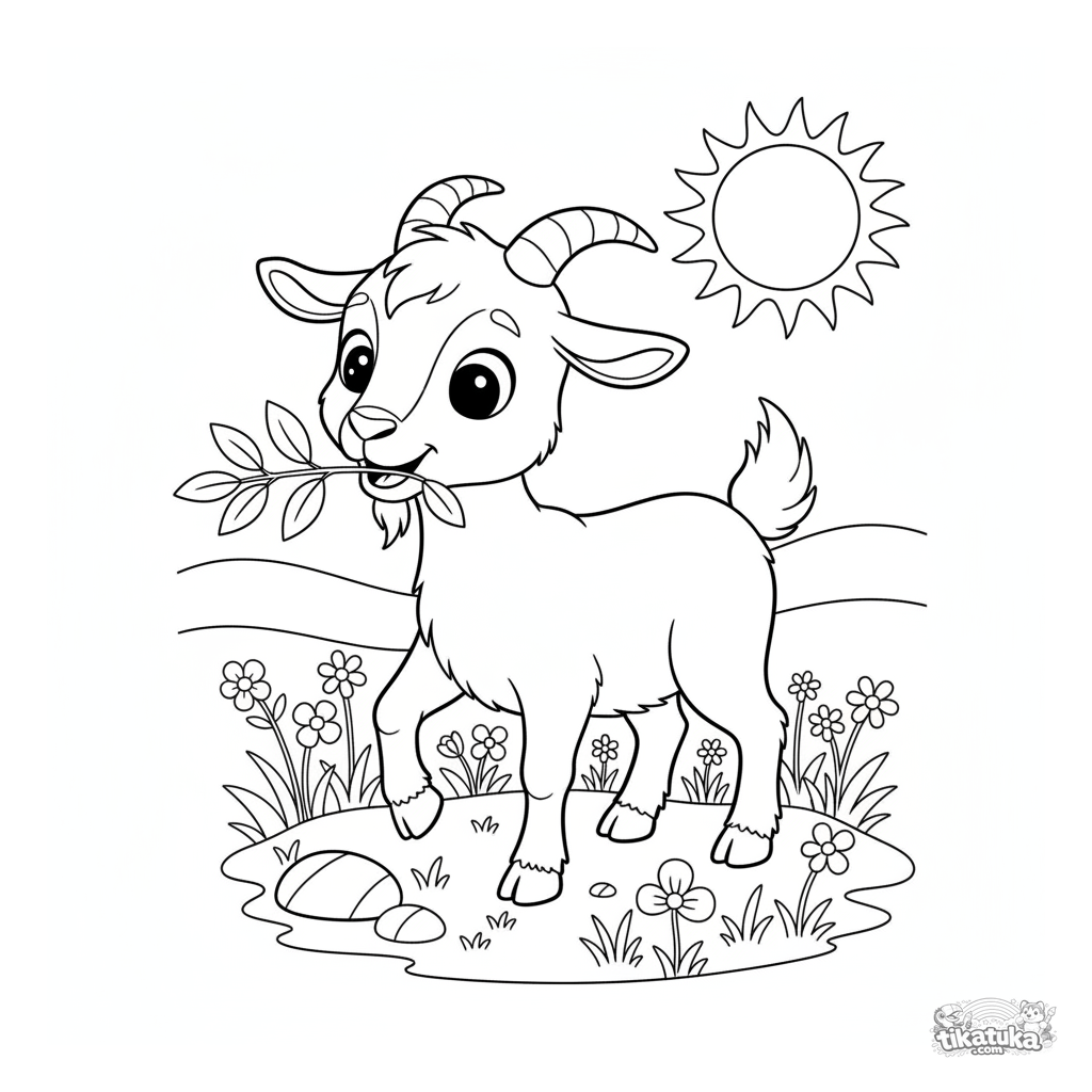 Ausmalbild für Kinder von 4 bis 6 Jahren. Ein verspieltes Zicklein mit lockigen Hörnern knabbert an einem Ast auf einer sonnigen Wiese.