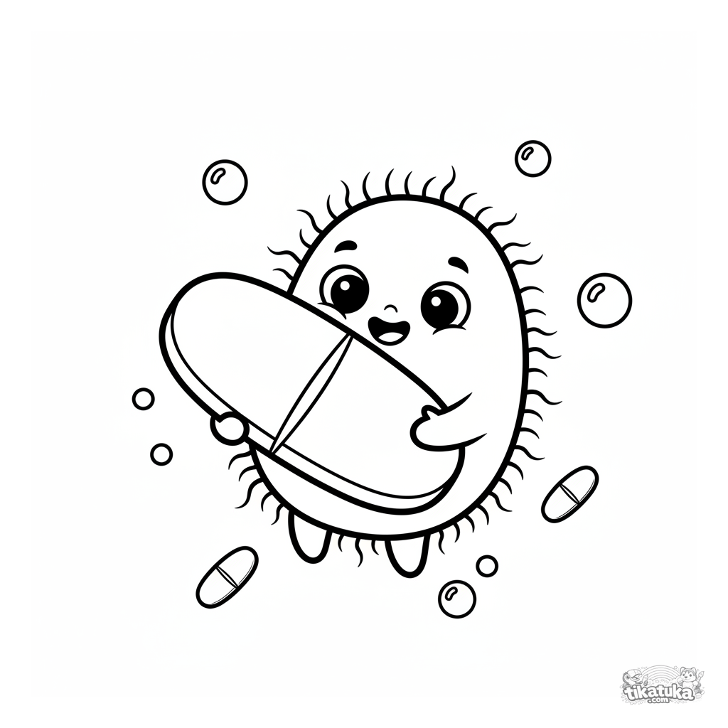 Super einfaches Ausmalbild für Kleinkinder 2-3: Ein niedliches, bohnenförmiges Bakterium umarmt eine riesige Vitaminpille. Sehr großer weißer Rand, eine große Figur.