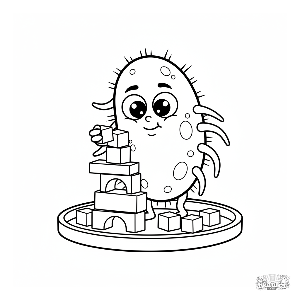 Einfaches Ausmalbild für Kleinkinder von 2 bis 3 Jahren. Eine freundliche Mikrobe mit großen Augen baut einen Turm aus Bauklötzen auf einer Petrischale. Große Formen, wenige Details.