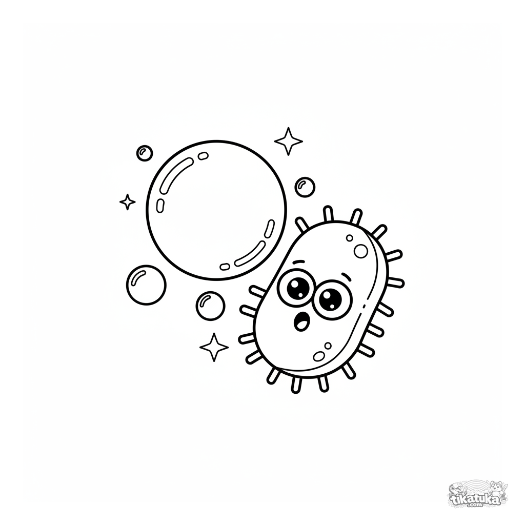Sehr einfaches Kleinkind Ausmalbild 2-3 Jahre: Ein freundliches Bakterium mit großen Augen schwebt nahe einer Seifenblase. Große, geschlossene Formen.