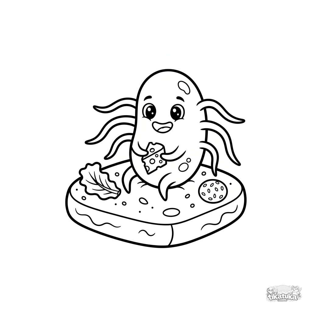 Ausmalbild für Kleinkinder 2-3: Ein freundliches Bakterium mit Geißeln macht Picknick auf einem Brotkrümel. Sehr einfache, große Formen, wenige Linien.