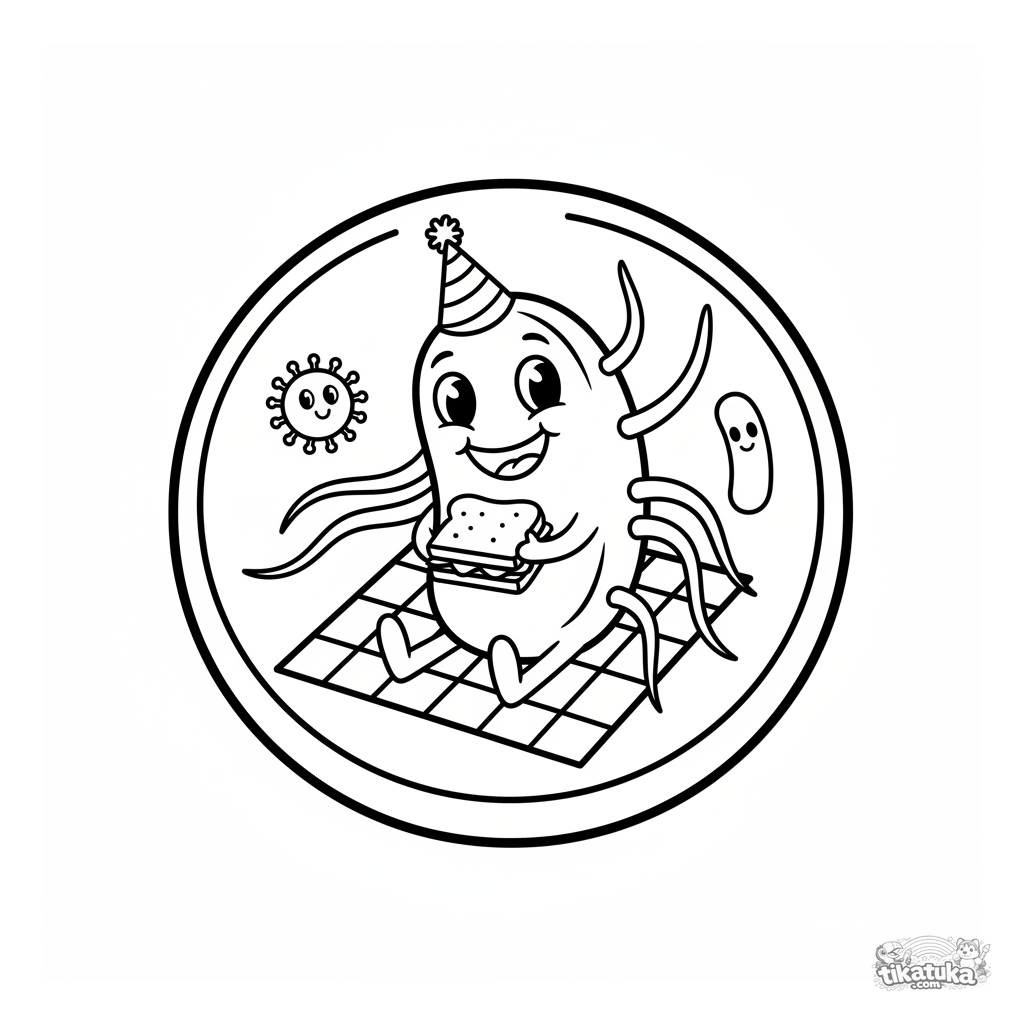 Ausmalbild für Kleinkinder von 2-3 Jahren: ein niedliches, freundliches Bakterium mit Flagellen picknickt auf einer Petrischale.