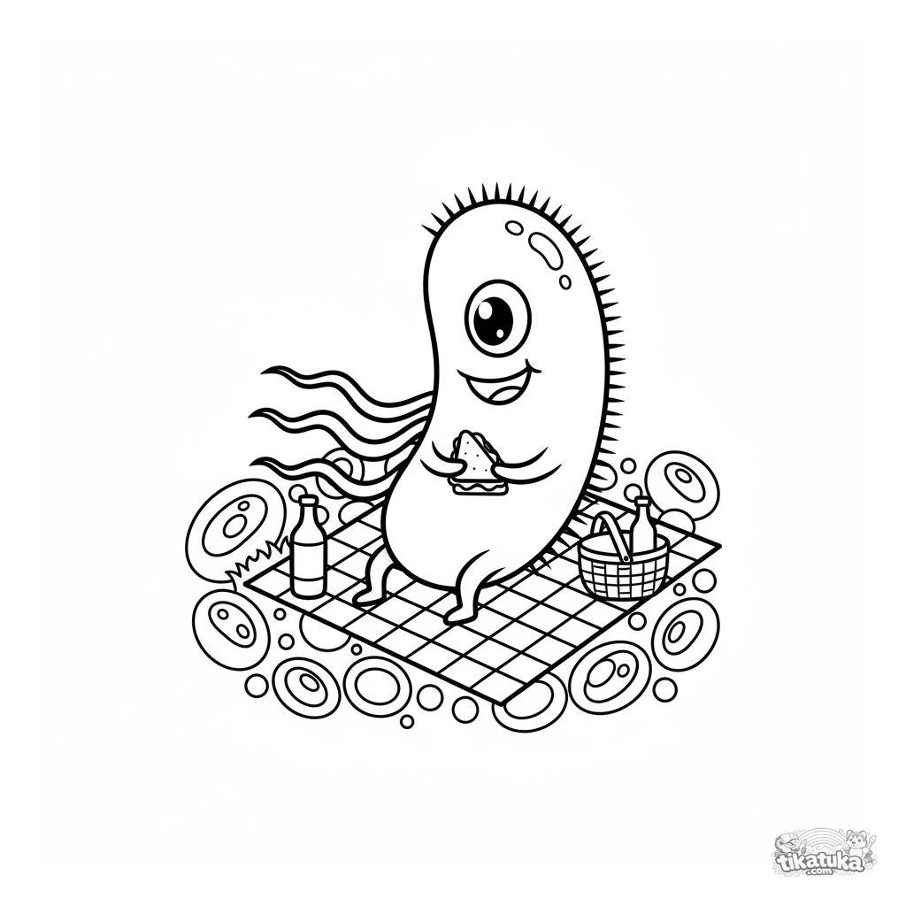 Einfaches und lustiges Ausmalbild eines freundlichen Bakteriums beim Picknick. Für Kleinkinder von 2-5 Jahren. Das Bakterium mit Geißeln sitzt auf einer Zellen-'Wiese' mit einem Sandwich und einem Korb.
