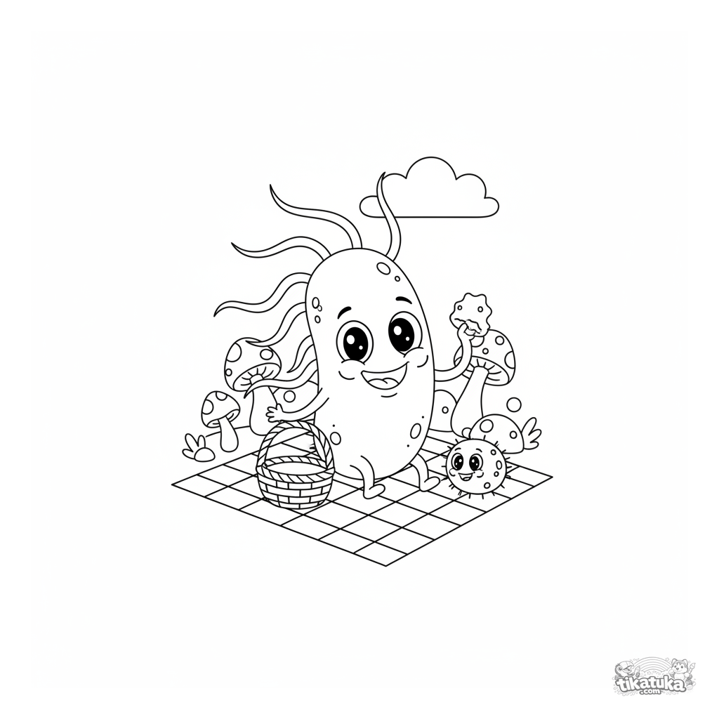 Lustiges Ausmalbild für Kinder 5-7: Ein süßes Bakterium macht ein Picknick auf einer karierten Decke. Mittlere Detailgenauigkeit, pädagogisches Thema.