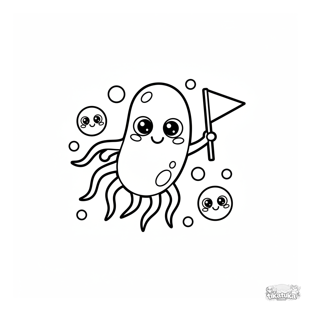 Ausmalbild mit niedlichen Mikroben. Für Kleinkinder von 2-5 Jahren. Ein freundliches Bakterium mit Geißeln hält eine winzige Flagge, andere Mikroben schweben in der Nähe. Sehr einfache, lustige Formen.
