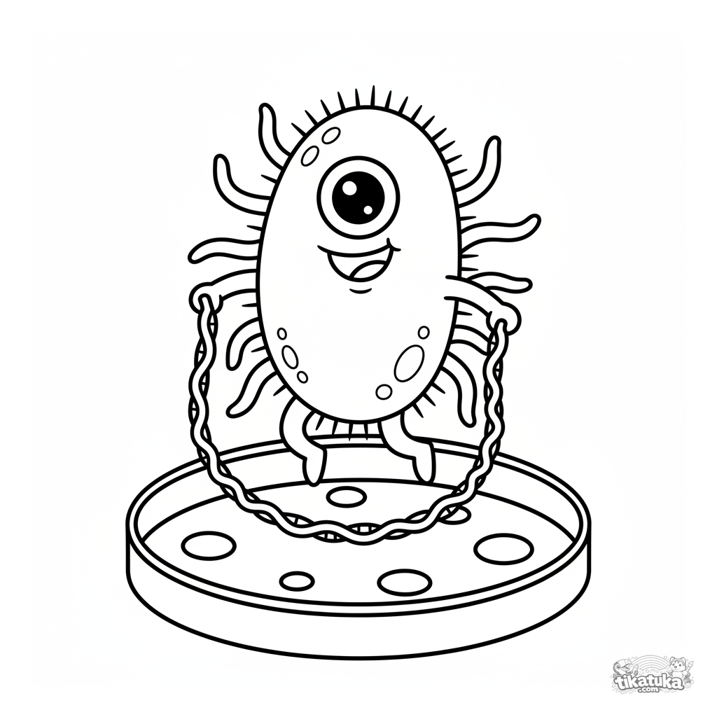 Ausmalbild für Kleinkinder 2-3: Ein süßes, freundliches Bakterium mit Flagellen spielt Seilspringen mit einem DNA-Strang in einer Petrischale. Sehr einfache Formen.