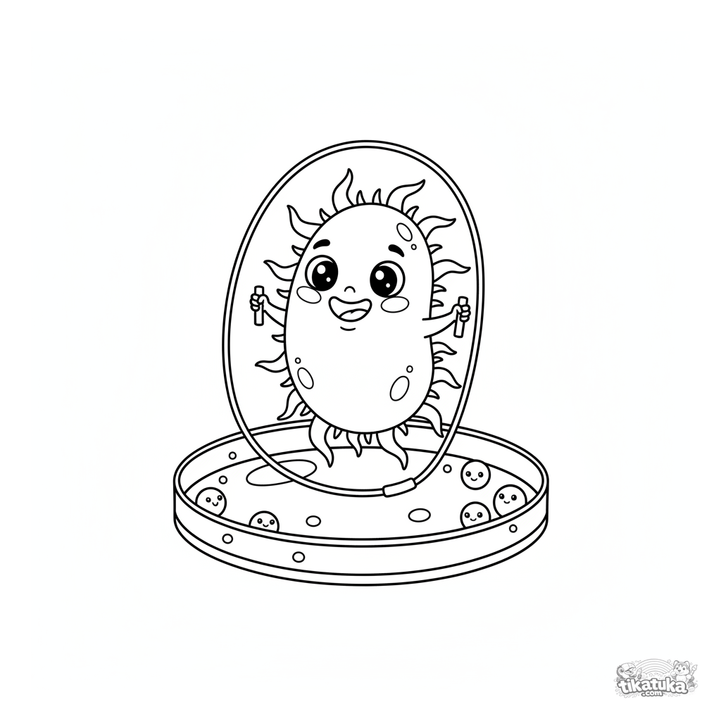 Mikroben-Ausmalbild für Kinder 4-6: Ein freundliches Bakterium spielt Seilspringen in einer Petrischale. Eine lustige, lehrreiche Cartoon-Szene.