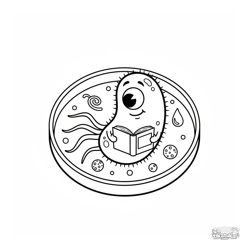 Lustiges Ausmalbild: Ein niedliches Bakterium liest ein Buch in einer Petrischale. Für Kinder von 5-8. Enthält Plasmide und Viruspartikel.