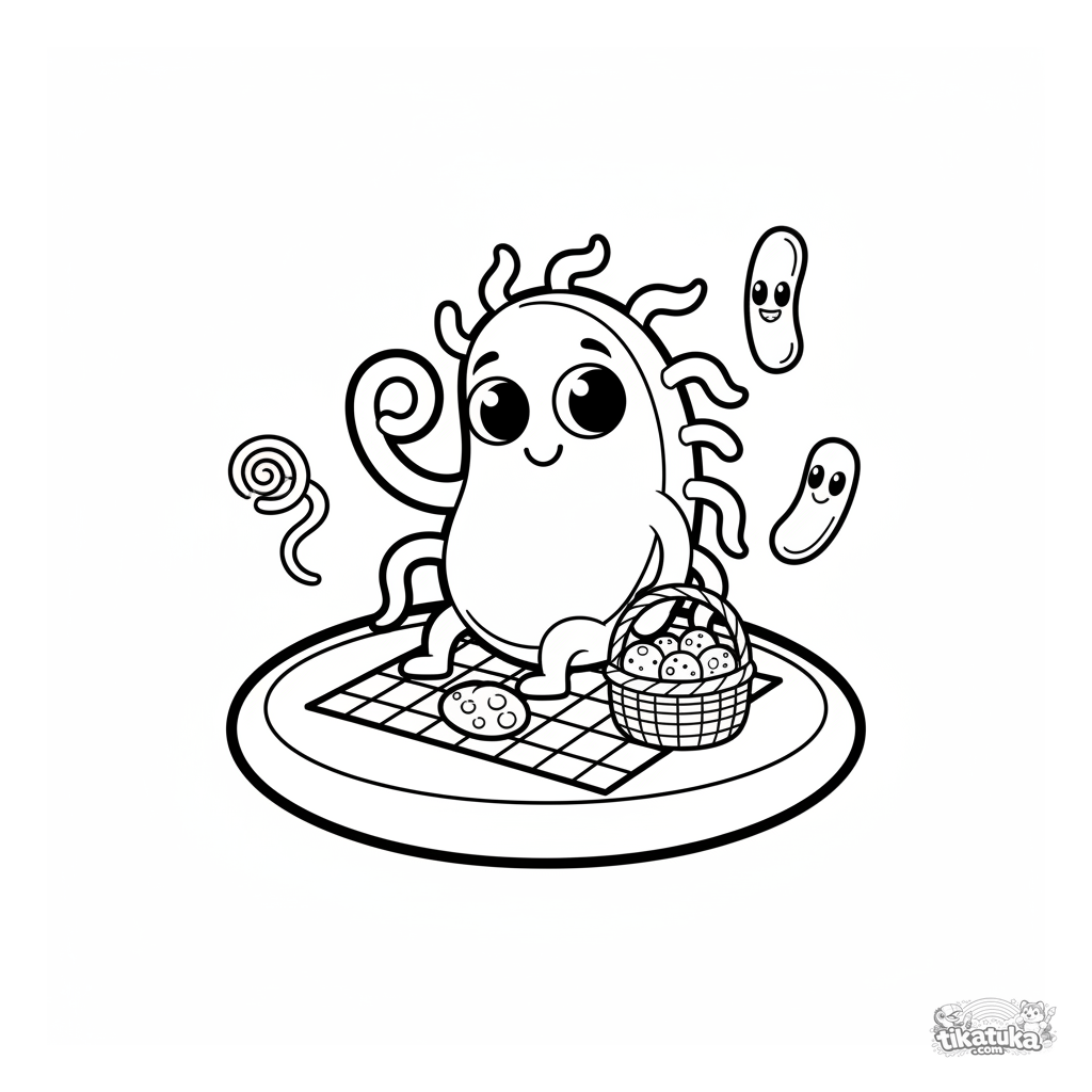 Ausmalbild eines süßen Cartoon-Bakteriums, das auf einer Zelle picknickt. Für Kleinkinder von 2 bis 5 Jahren.