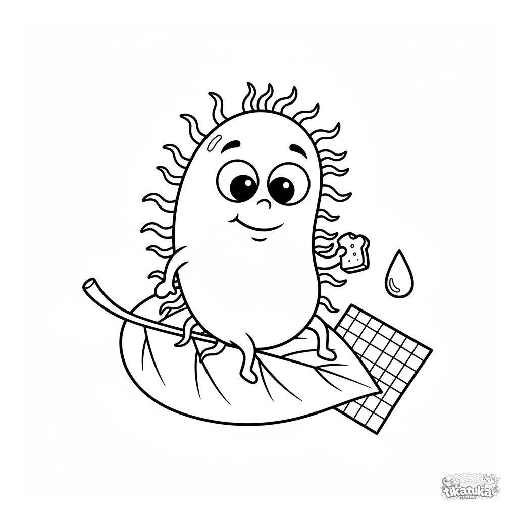 Lustiges Ausmalbild eines freundlichen Bakteriums, das auf einem Blatt picknickt. Für Kleinkinder von 2-5 Jahren.