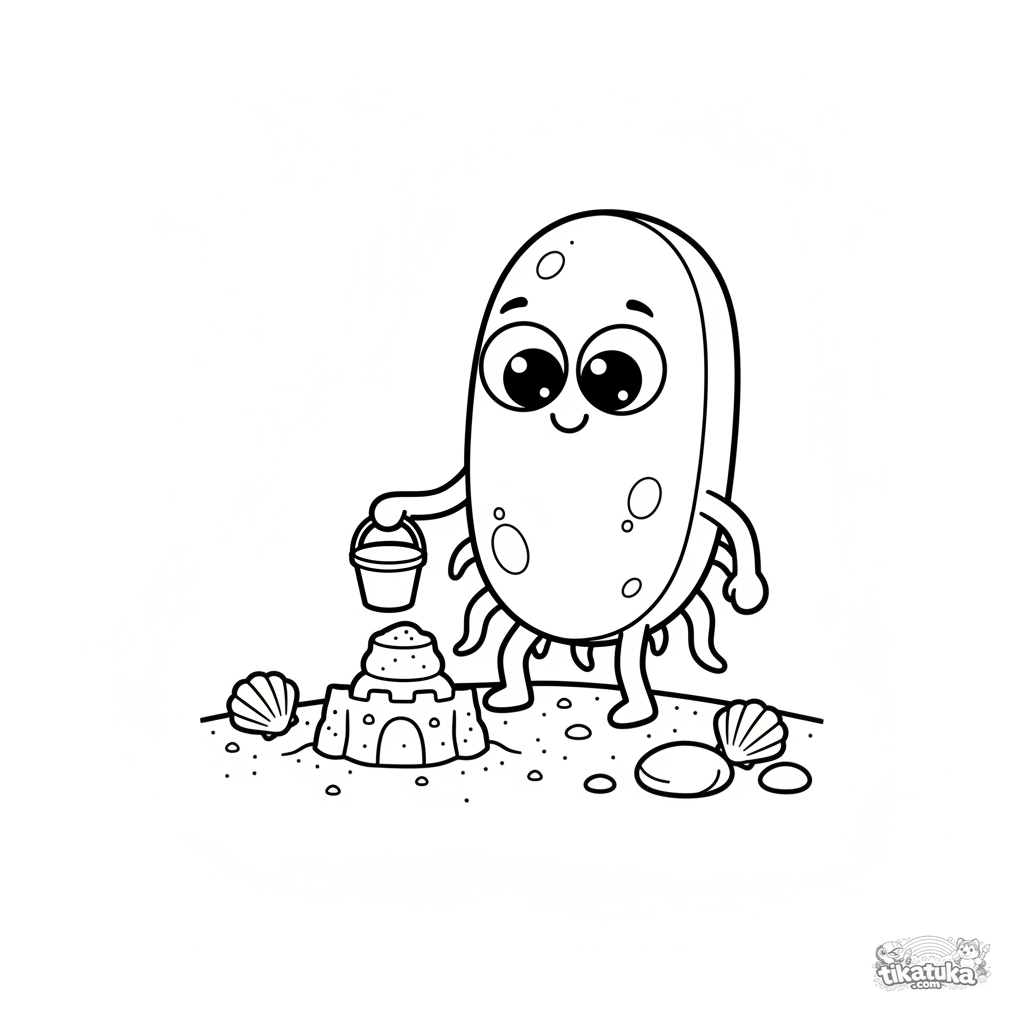 Einfaches Ausmalbild für Kleinkinder 2-3: Ein freundliches Bakterium baut eine Sandburg. Sehr große, einfache Formen, kaum Hintergrund.