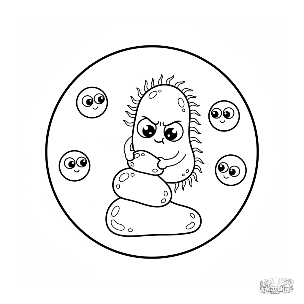 Ein Ausmalbild zum Thema Mikroben mit Detailgrad Einfach. Es passt für das Alter 2-3 Jahre, lässt sich gut zu Hause drucken und sofort online öffnen.