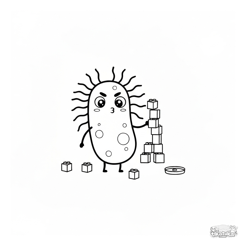 Einfaches Ausmalbild eines niedlichen Cartoon-Bakteriums, das einen Turm aus Bauklötzen baut. Für Kleinkinder von 2 bis 5 Jahren.