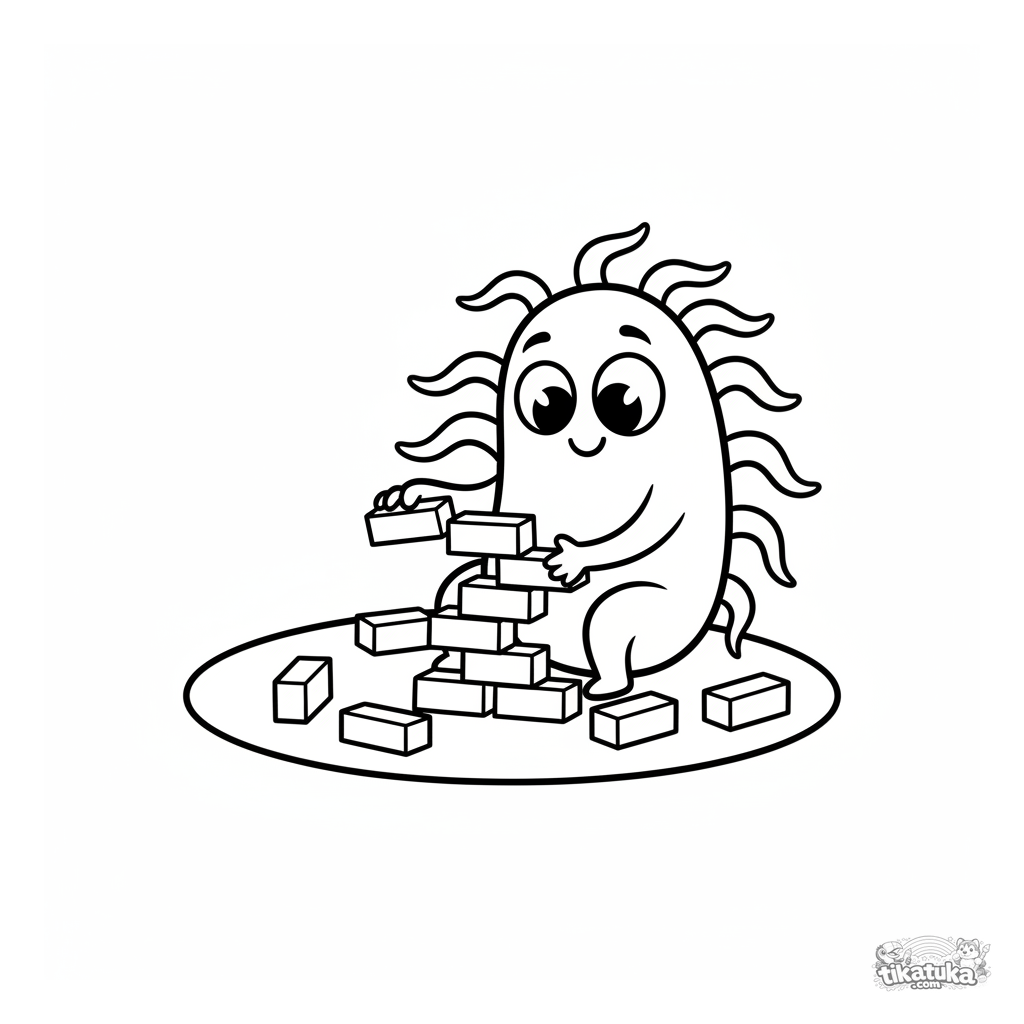 Einfaches und süßes Ausmalbild eines freundlichen Bakteriums, das einen Blockturm baut. Für Kleinkinder von 2-5 Jahren.
