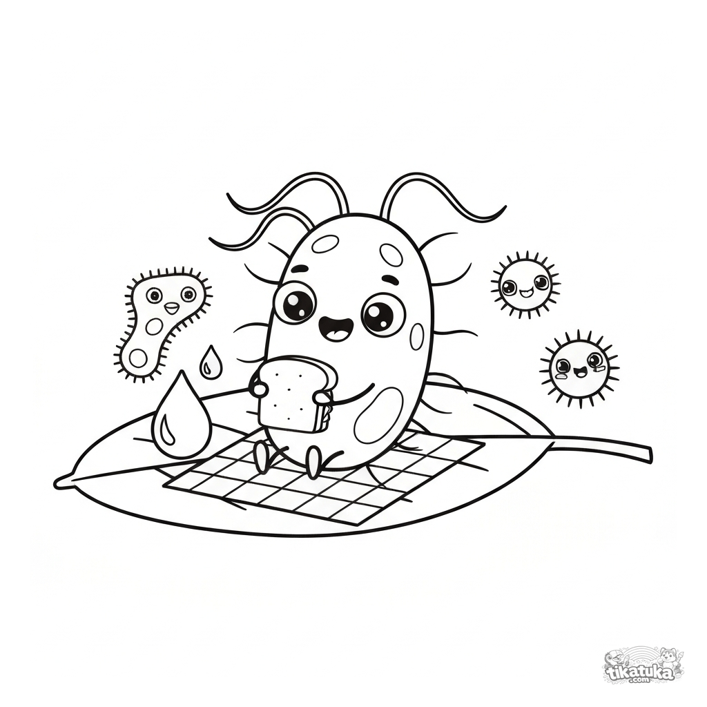 Einfaches und lustiges Ausmalbild eines freundlichen Bakteriums beim Picknick auf einem Blatt. Für Kleinkinder von 2 bis 5 Jahren.