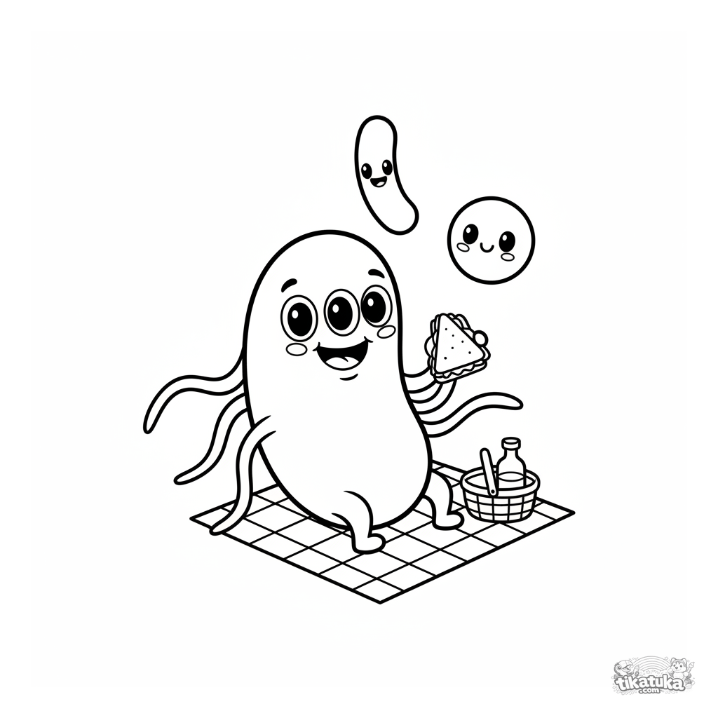 Einfaches Ausmalbild mit einem niedlichen Cartoon-Bakterium beim Picknick. Für Kleinkinder von 2-5 Jahren. Das Bakterium hat mehrere Augen und Geißeln, mit einem Korb und mikrobiellen Freunden in der Nähe.
