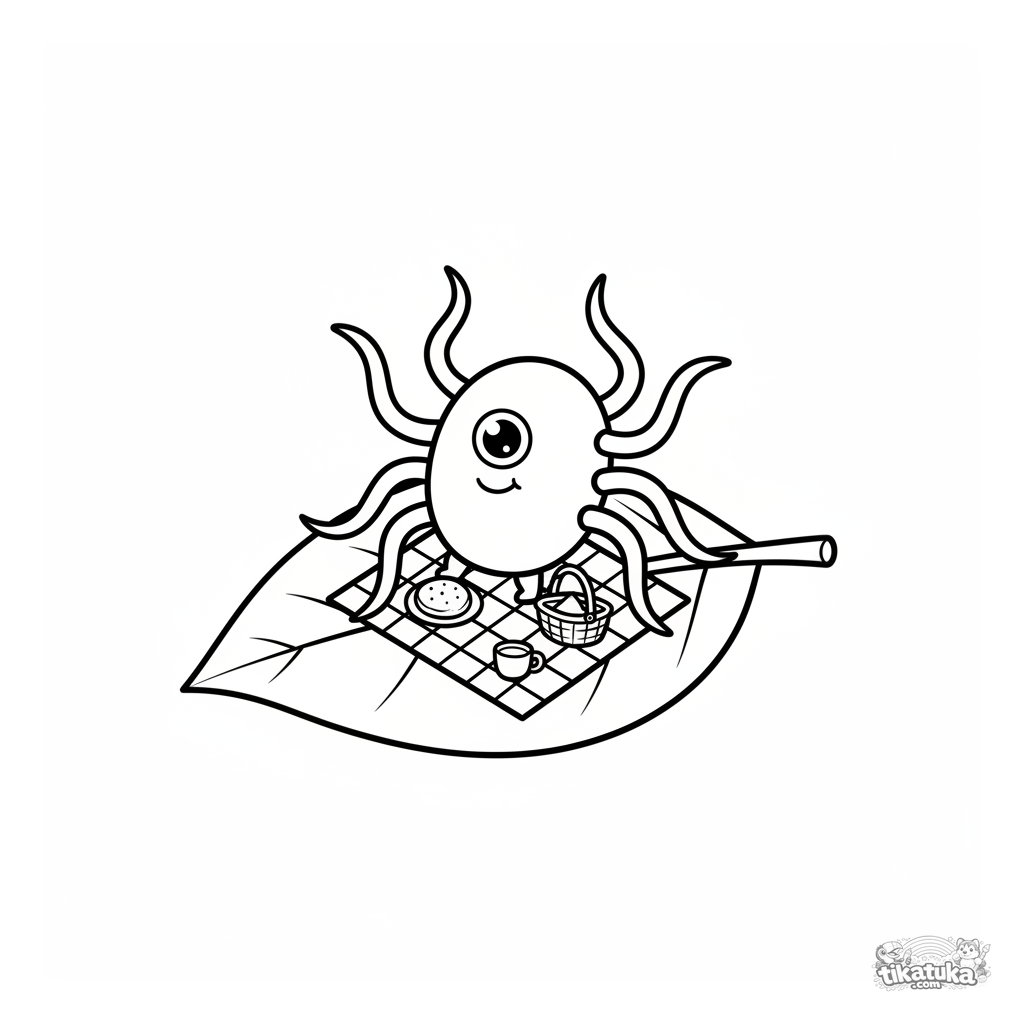 Ausmalbild eines niedlichen Bakteriums, das seine Geißeln benutzt, um auf einem Blatt zu picknicken. Für Kleinkinder von 2-5 Jahren. Eine lustige mikroskopische Szene.