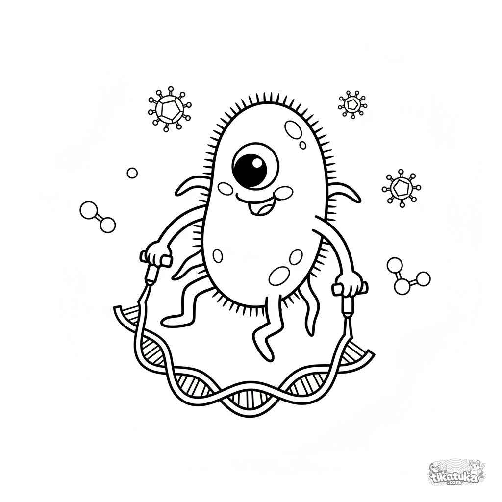 Niedliches Cartoon-Bakterium mit einem großen Auge springt fröhlich mit einem Springseil aus DNA-Strängen. Einfaches Ausmalbild für Kleinkinder von 2 bis 5 Jahren.