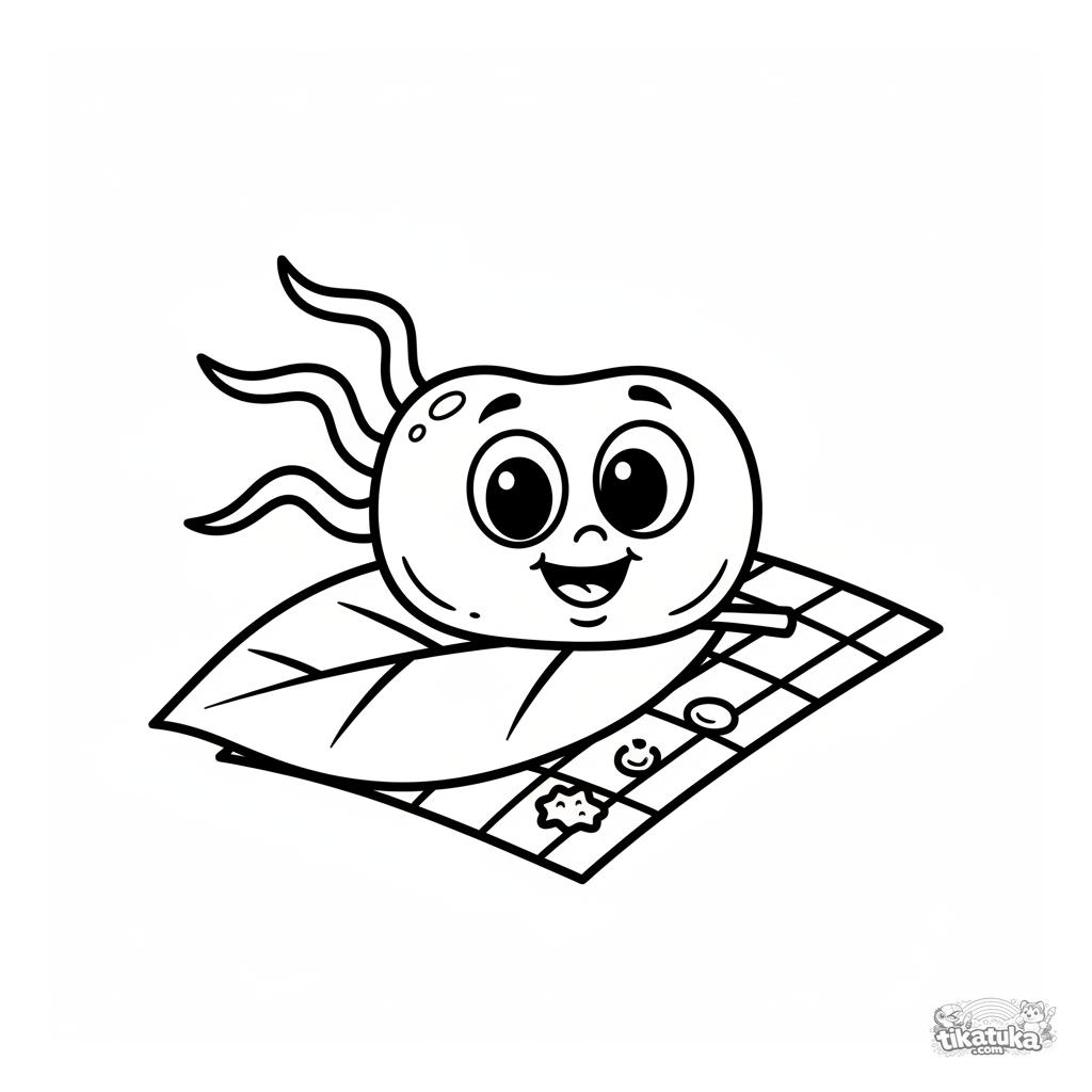 Lustiges Ausmalbild eines Cartoon-Bakteriums, das auf einem Blatt picknickt. Für Kleinkinder von 2-5 Jahren. Einfache Szene mit karierter Decke, Wassertropfen und Krümel.