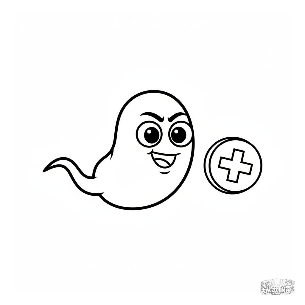 Einfaches Kleinkind-Ausmalbild für 2-3 Jahre: Ein freundliches Cartoon-Bakterium mit großen Augen jagt eine Vitaminpille. Große, klare Formen ohne Hintergrund.