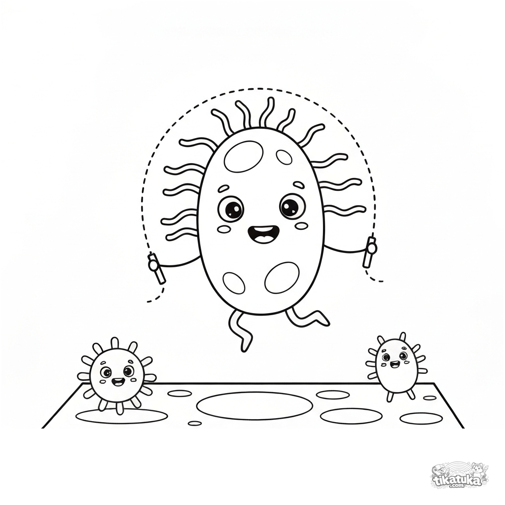 Lustiges Ausmalbild eines freundlichen Cartoon-Bakteriums, das Seil springt. Für Kleinkinder von 2-5 Jahren.