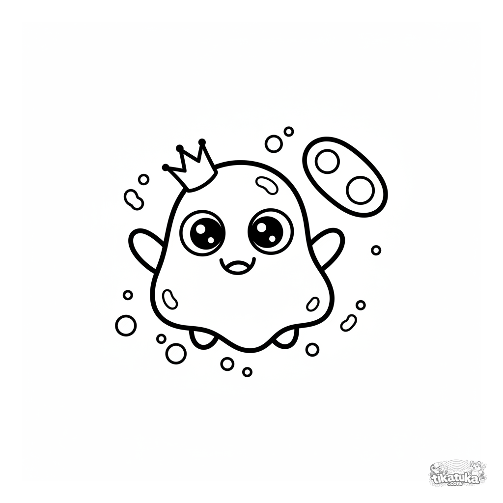 Ausmalbild für Kleinkinder von 2-3 Jahren: eine niedliche Cartoon-Mikrobe mit Glubschaugen und Krone schwebt nahe einer Zelle. Sehr einfache, große, geschlossene Formen.