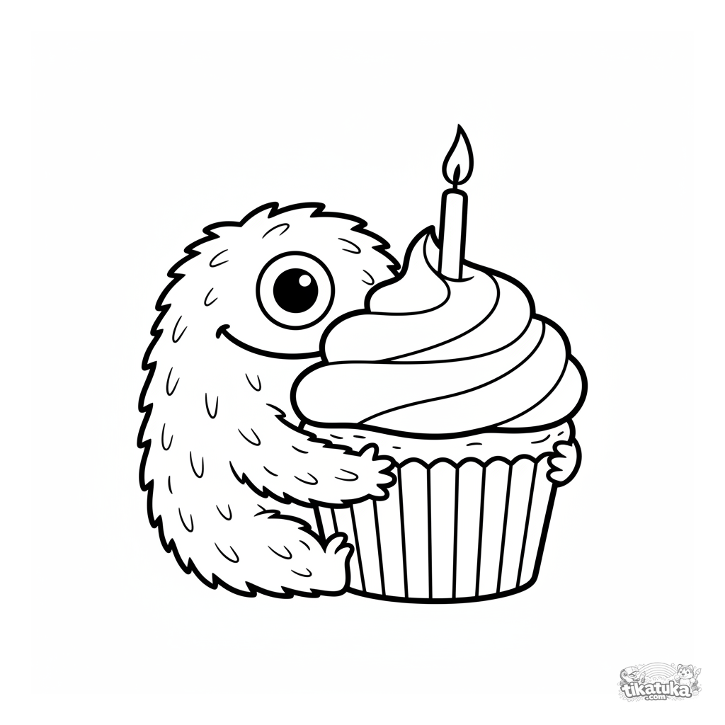 Ausmalbild für Kleinkinder 2-3: Ein pelziges, freundliches Monster mit einem Auge umarmt einen großen Cupcake. Extrem einfache und große Formen.