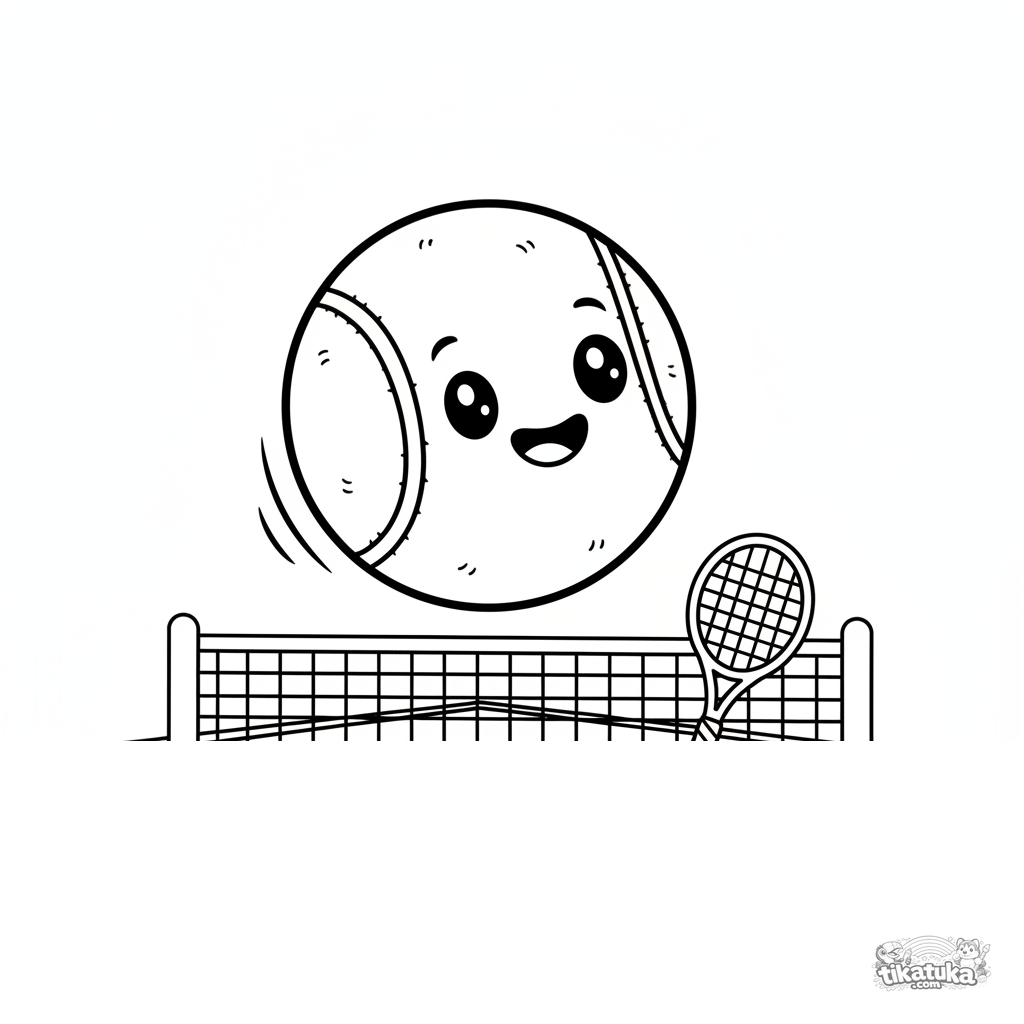 Einfaches Ausmalbild für Kleinkinder 2-3: ein großer Plüsch-Tennisball mit Lächeln hüpft am Netz. Große Formen, breite Ränder zum Ausmalen.