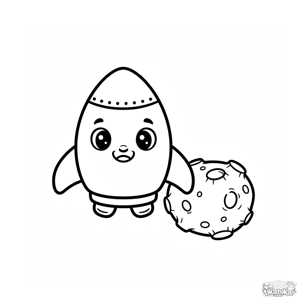 Ausmalbild für Kleinkinder 2-3: Eine süße Rakete mit Augen fliegt nahe einem Asteroiden.