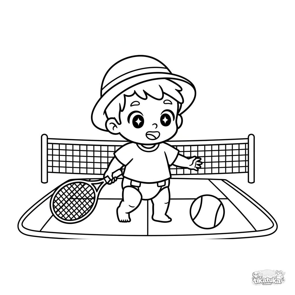 Ausmalbild für Kleinkinder 2-3: Kind mit großem Schläger jagt Ball auf Tennisplatz. Einfache, große Formen für erste Stifte.
