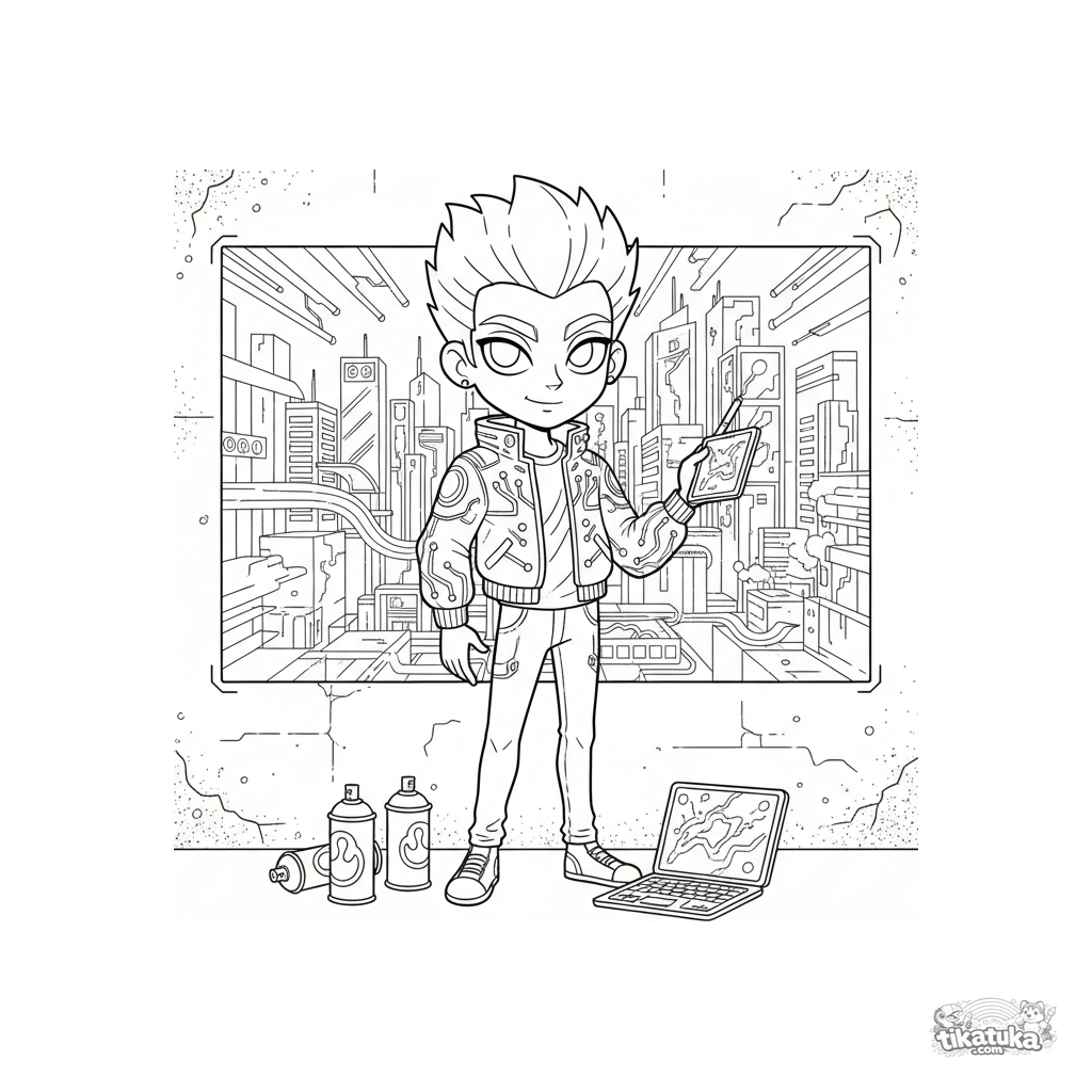 Ausmalbild für Kinder von 10-12 Jahren: ein Cyberpunk-Graffiti-Künstler erstellt ein digitales Wandbild in einem Keller. Dynamische Szene im Manga-Action-Stil.