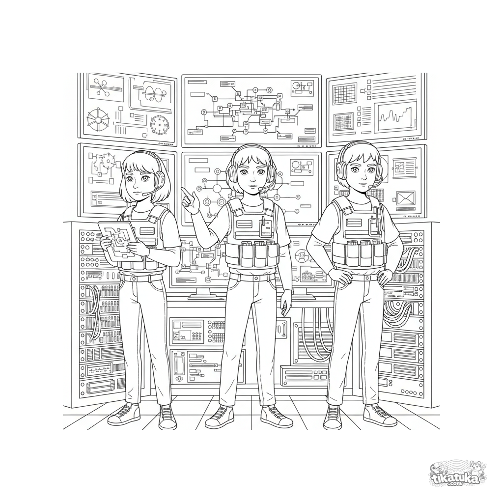 Komplexes Ausmalbild für 10-12 Jahre: Ein Cybersecurity-Team in einem Hightech-Keller-Kommandozentrum. Viele Details: Sicherheitsmonitore, Server-Racks, taktische Westen.