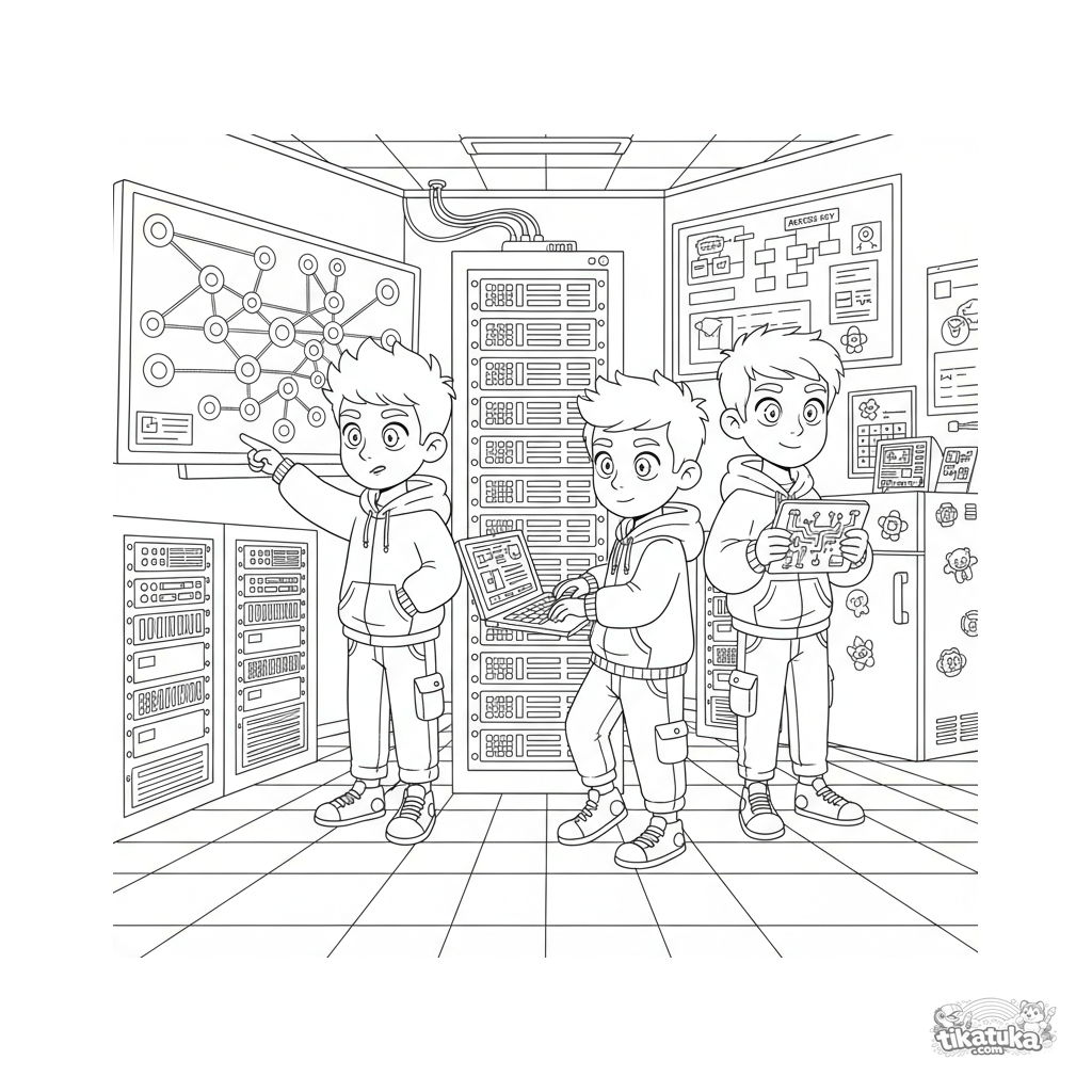 Ausmalbild mit einem Team von Teenagern, die Cybersicherheit in einem Keller-HQ betreiben. Viele Details: Server, Bildschirme, Laptops.