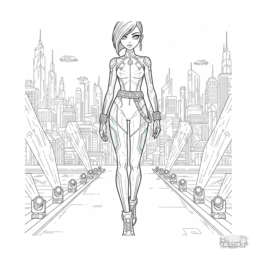 Komplexe Manga-Malseite: Ein Model im holografischen Jumpsuit läuft über einen Neon-Laufsteg. Dynamische Szene mit geometrischen Lichtern und futuristischer Kulisse für Mädchen 10-12.