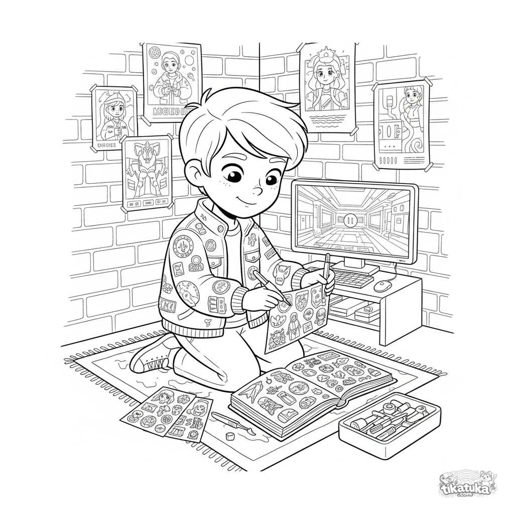Ausmalbild: Ein Teenager-Sticker-Sammler in einem gemütlichen Hacker-Keller. Viele Details: Poster, Monitor, Werkzeuge. Für Kinder 10-12.