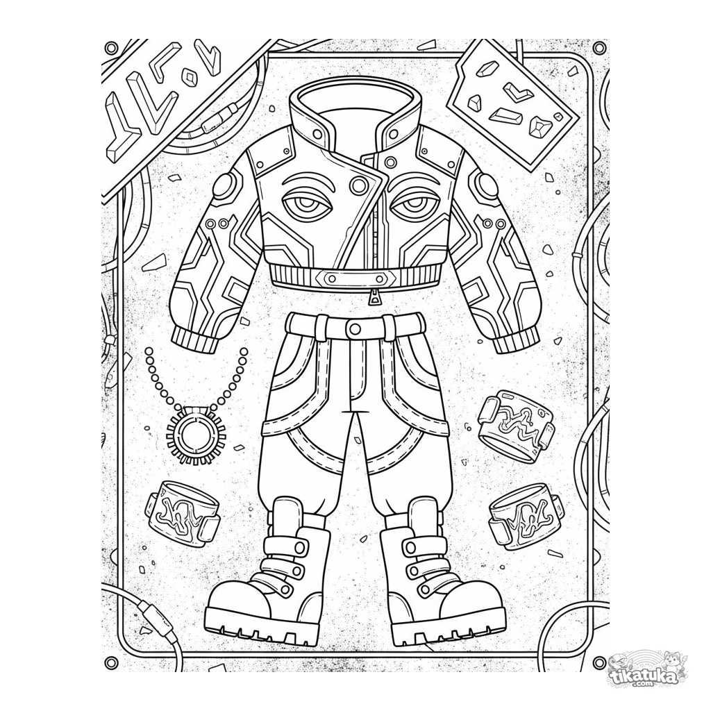 Komplexes Ausmalbild für 10-12 Jahre: Cyberpunk-Straßenmode in Flachlage mit detaillierten Tech-Accessoires und griffigen Hintergrundtexturen.