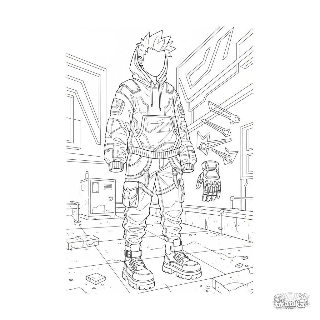 Komplexes Ausmalbild: Ein Cyberpunk-Streetwear-Outfit im Flatlay auf einem Dach. Für 10-12 Jahre, hohe Detailtreue bei Kleidung und Stadthintergrund.