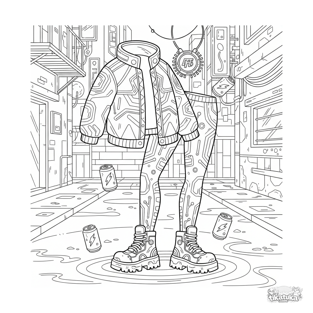 Komplexes Ausmalbild für Mädchen: Ein Cyberpunk-Streetwear-Outfit als Flatlay in einer Neon-Gasse. Holographische Jacke, Tech-Accessoires, detaillierter urbaner Hintergrund.