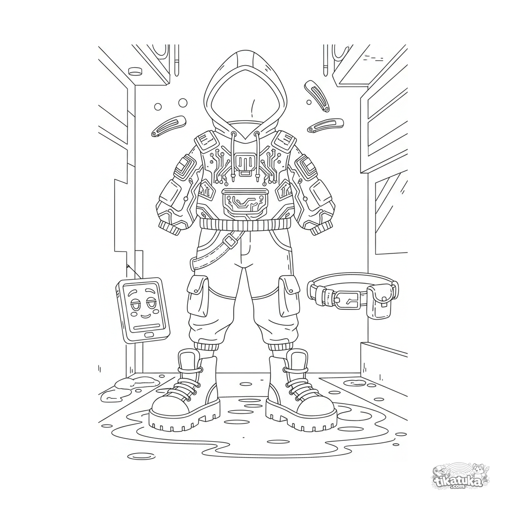 Ausmalbild für 10-12 Jahre: ein futuristischer Cyberpunk-Streetwear-Look als Flatlay auf nassem Neon-Gassenboden. Hoodie, Hose, Stiefel und Tech-Accessoires im Detail.