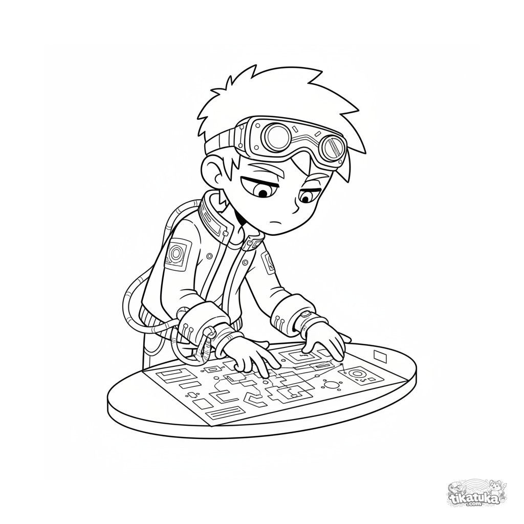 Ausmalbild für Kinder von 10-12: ein Teenager im Cyberpunk-Stil interagiert mit einer holographischen Schnittstelle und löst ein Puzzle in einem High-Tech-Hacker-Keller.